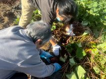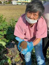 奥の方でちょうど収穫されている方達がいますね。こんにちは~、今年のサツマイモはいかがでしょうか?