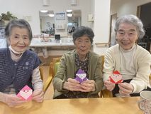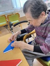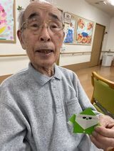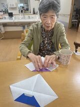 何ができるかは秘密にし、折り紙から好きな色を選んで頂き、職員さんレクチャーのもと折っていきます。