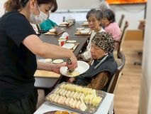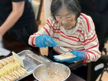 職員とともに好きな具材を挟んでいきます♪