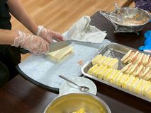 さて買ってきたパンとともにサンドウィッチを職員がカットして