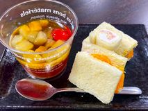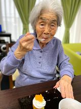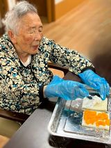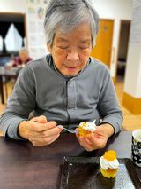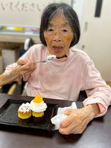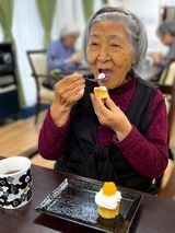 誕生日会の今月の誕生日の方の発表、お昼のパンバイキング、そして最後はゼリーとフルーツサンドイッチ。