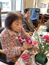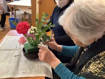 皆様それぞれ自分が生けたお花を眺めて「久しぶりにお花を生けたよ。」「見て、こんなにきれい!」と笑顔。