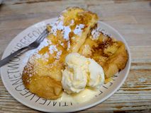 焦げ目とメープルシロップ、バニラアイス、粉砂糖が食欲をそそります。