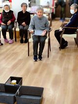 今回は「お手玉シュート」という名前で椅子に座り一定の距離でかごに入れていく遊びです。50点のかごの中に100点があるのでそこにどうやって入れるかが攻略の鍵ですね。