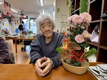 ・若松(まっすぐ伸びた背の高いノッポさん) ・金明竹(白っぽく見える竹) ・米(頭を垂れた稲穂) ・ナン天(赤い小粒の果実) ・オペラピンク(スプレーギク・淡いピンクの花) ・金扇(プラスチックの造形物)