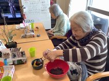 元気よくお菓子撒きを行い、おやつの時間にはあんみつをみんなで作って食べました。