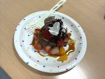 ロールケーキに苺や生クリーム、フルーツを盛り付け、