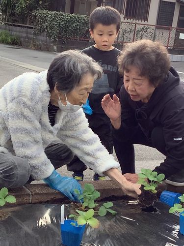 施設の庭に利用者様といちごの苗を植えまし